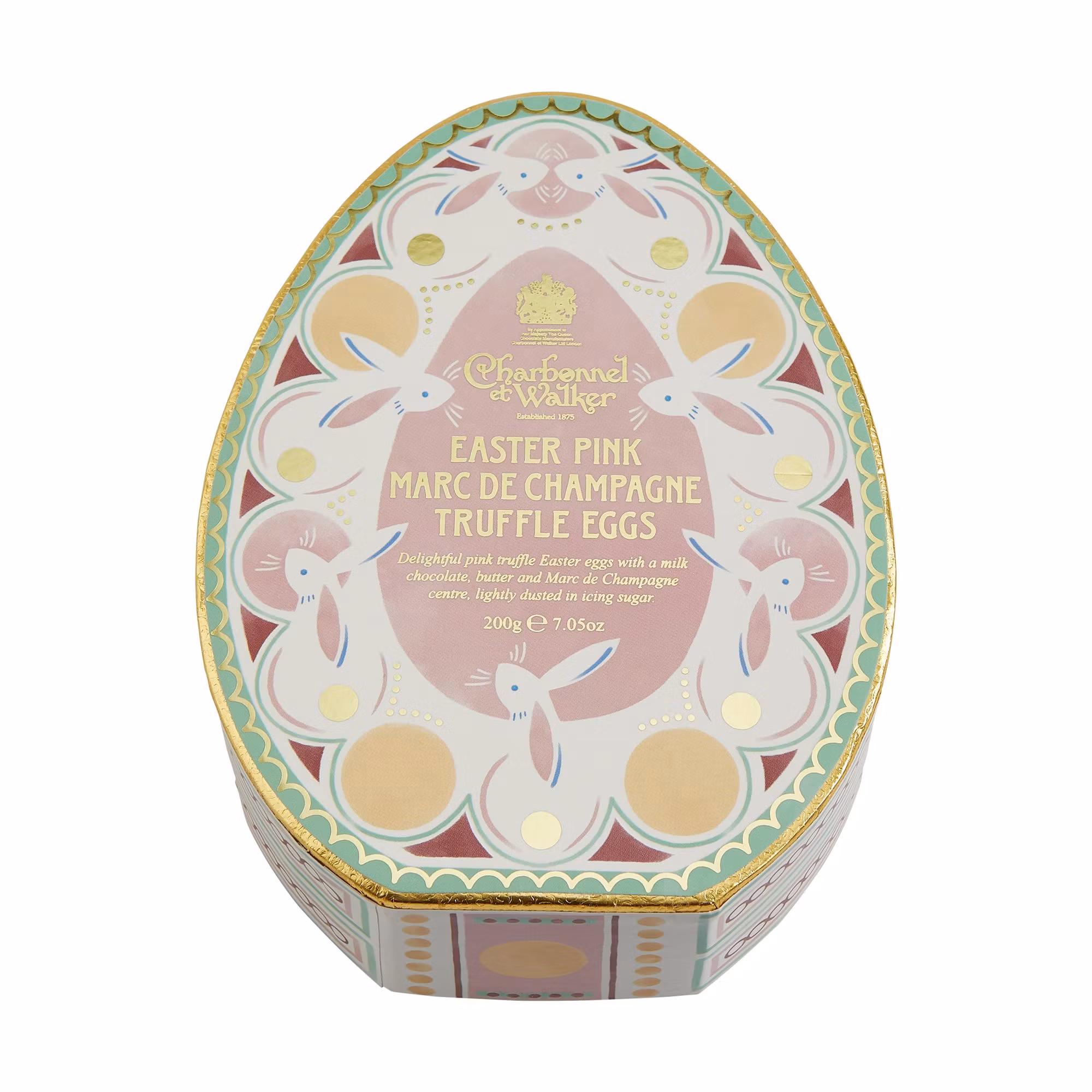 En eksklusiv påskegave fra britiske Charbonnel et Walker, presentert i en vakkert illustrert, eggformet gaveeske. Inne i esken finner du deres ikoniske Pink Marc de Champagne-trøfler, formet som små påskeegg.