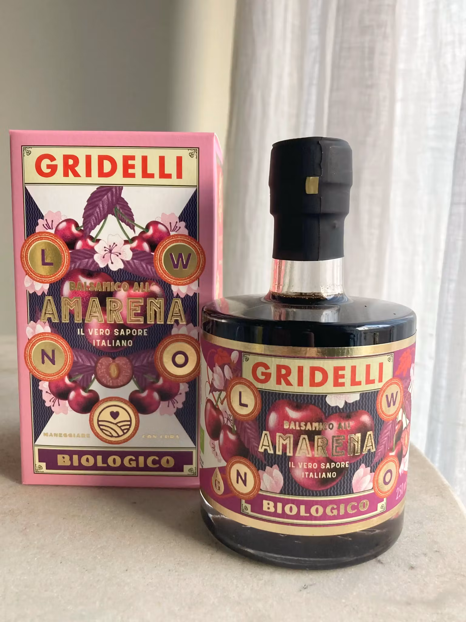 Kirsebær Balsamico fra Gridelli er en økologisk, fruktig og elegant balsamico laget på modne italienske kirsebær. Den har en naturlig dyp sødme, en rik bærkarakter og en myk syre som gir en balansert og delikat smak, perfekt når du ønsker noe litt mer aromatisk enn klassisk balsamico.