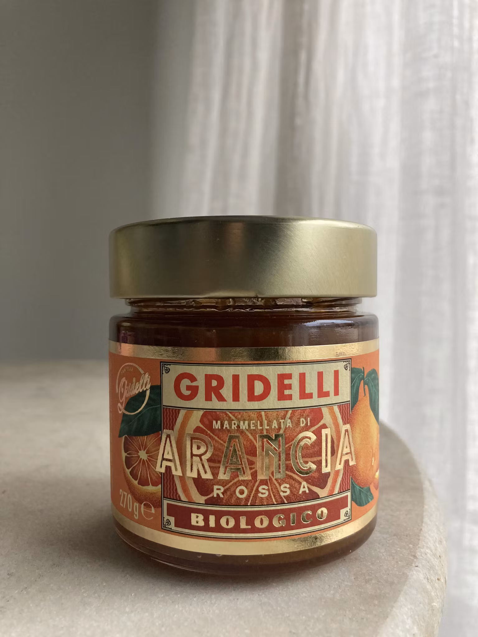 Marmellata di Arancia Rossa fra Gridelli er en økologisk italiensk marmelade laget på solmodne blodappelsiner høstet i Sør-Italia. Den er fyldig, fruktig og naturlig frisk, med en perfekt balanse mellom sødme og den lett bitre elegansen som gjør blodappelsin så karakteristisk.