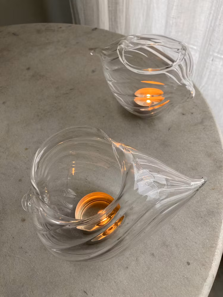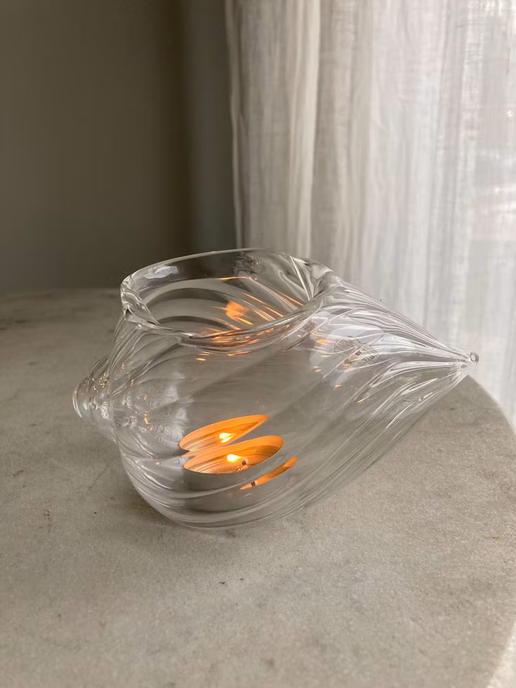 En skjønn glasslykt som også kan brukes som vase. Håndlaget. Små ulikheter kan forekomme. Lenge: 15 cm. Bredde: 9 cm. Høyde: 8 cm.