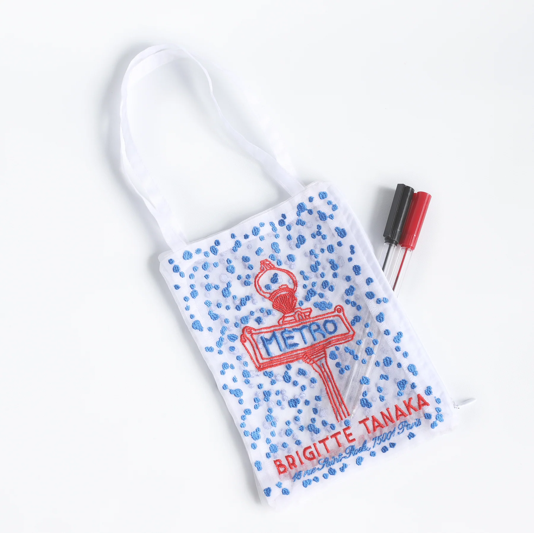 Metro Bag fra Brigitte Tanaka fanger følelsen av byliv i bevegelse. Den transparente organzaen gir et lett og elegant uttrykk, mens de detaljerte broderiene skaper et kunstnerisk spill mellom det praktiske og det poetiske.