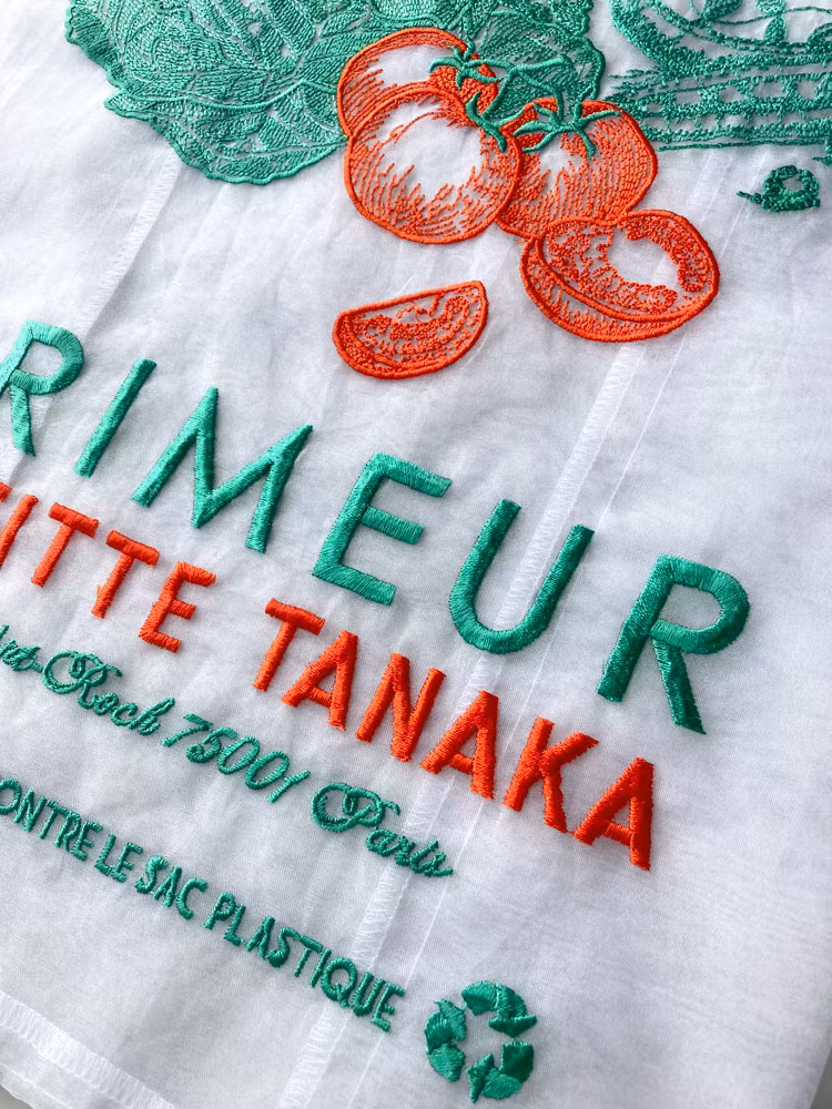 Primeur Bag er en poetisk hyllest til grønnsaksmarkedet. De broderte motivene gir liv og karakter, mens organzaen holder uttrykket lett og moderne.